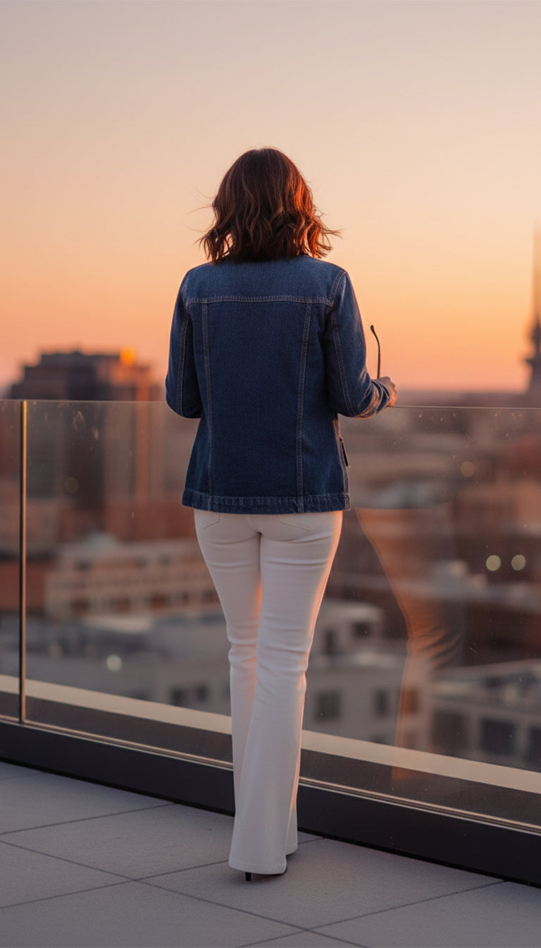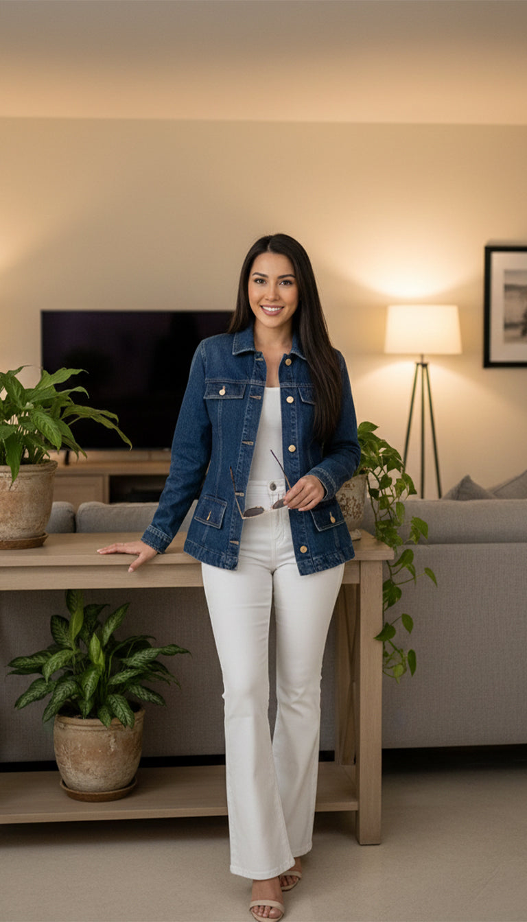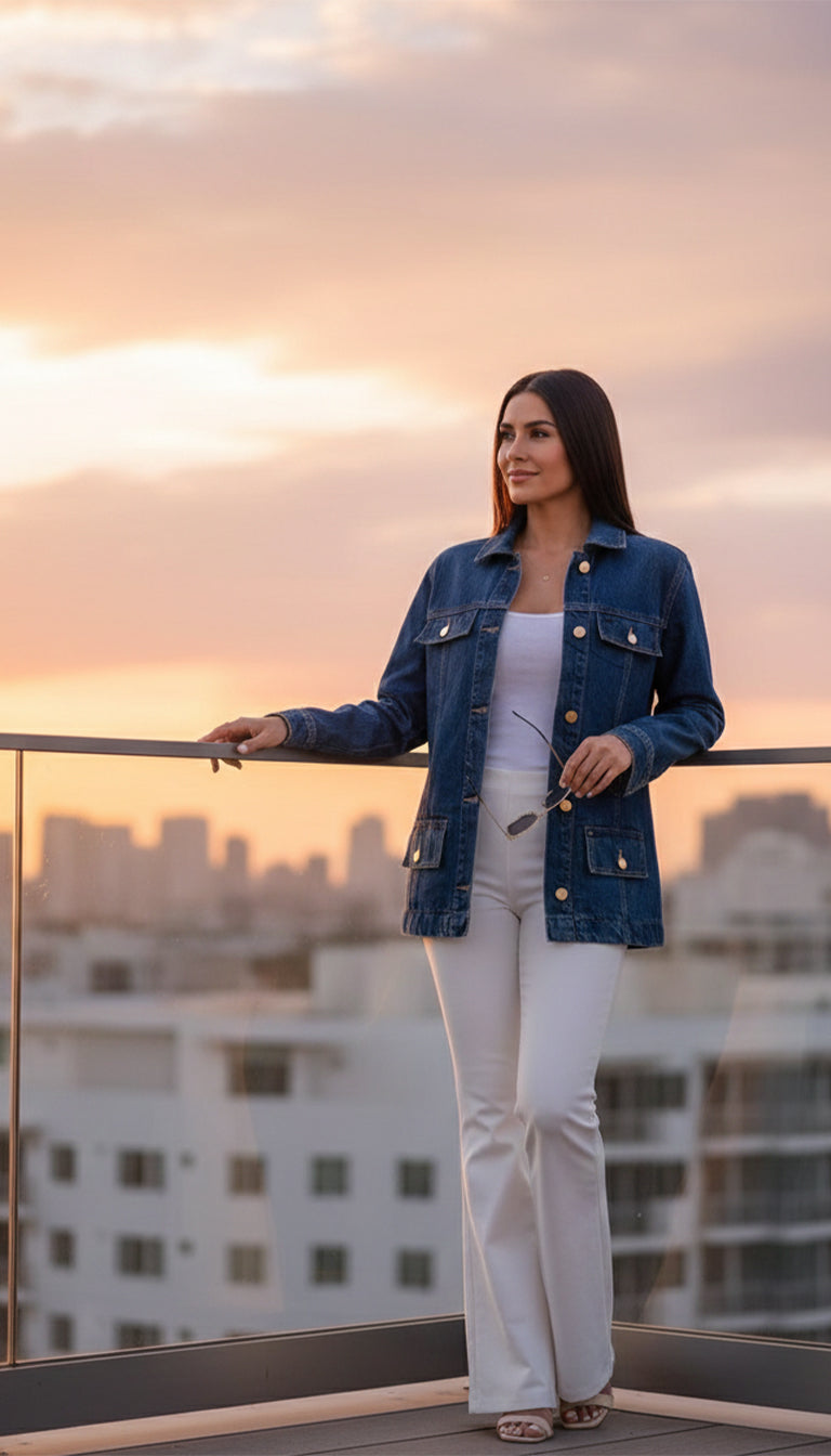 Featuring a button-front closure, functional flap pockets, and a tailored silhouette, this versatile denim jacket pairs beautifully with jeans, trousers, dresses, or skirts. The durable yet soft fabric ensures all-day comfort, while the flattering cut enhances your natural shape. Ideal for year-round wear, it transitions seamlessly from daytime casual to evening chic.